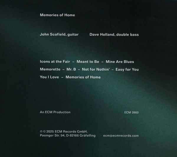 Der Gitarrist John Scofield und der Bassist Dave Holland, zwei der zeitgenössischen Meister des Jazz, haben im Laufe der Jahre in verschiedenen Zusammenhängen zusammengespielt - darunter Projekte mit Herbie Hancock und Joe Henderson sowie eine energiegeladene Gruppe mit Joe Lovano und Al Foster. Memories of Home ist nun ihr erstes Duo-Album, letztes Jahr nach ausgiebigen Tourneen in den NRS Studios in Catskill, New York, aufgenommen. John Scofield: 'Die Platte enthält, genau wie unsere Live-Shows, Stücke, die jeder von uns komponiert hat, einige neu, einige alt. Wir teilen jahrzehntelange gemeinsame musikalische Bezugspunkte. Die Gemeinsamkeiten und Unterschiede in unseren Herangehensweisen machen die Zusammenarbeit, wie ich finde, umso spannender.' Das Album enthält Scofields Songs 'Icons at the Fair', 'Meant to Be', 'Mine Are Blues', 'Memorette' und 'Easy for You' sowie Hollands 'Mr. B', 'Not for Nothin'', 'You I Love' und 'Memories of Home'.