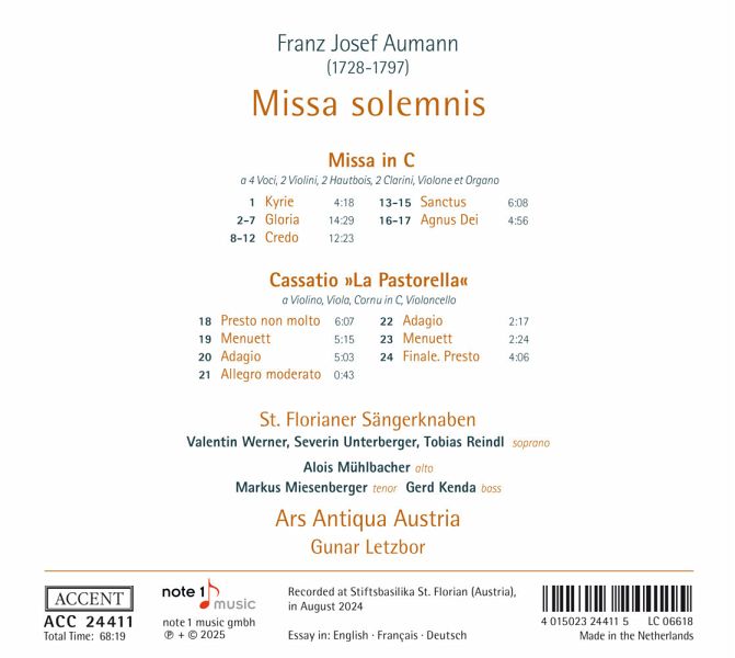 Aumann bekam seine musikalische Ausbildung als Sängerknabe in Wien zusammen mit Michael Haydn und Johann Georg Albrechtsberger. 1753 trat er in das Stift St. Florian ein, wo er später über vier Jahrzehnte die Kirchenmusik leitete. Seine große C-Dur Messe ist mit der prachtvollen Besetzung mit Oboen, Trompeten und Pauken eine echte "Missa solemnis". Die Instrumentalmusik zeichnet sich neben virtuosen und kunstvollen Passagen auch durch die Einbeziehung von Volksmusikelementen aus. Solches ist deutlich spürbar in der Cassatio "La Pastorella", die 1777 zu Weihnachten erklang.