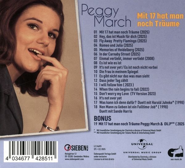 Meine Lieblingsstücke und wichtigsten Songs auf einem Album zu haben, ist großartig. Es ist eine tolle Collection entstanden. Zurückzuschauen und auszuwählen, hat mein Herz erfüllt und macht mich sehr happy. I love it! And I'm very thankful. What an amazing time!' (Peggy March 2025) Peggy March, eine Ikone der Schlagerwelt, verabschiedet sich mit ihrem letzten Album 'Mit 17 hat man noch Träume - Die Jubiläums-Edition', das am 2. Mai 2025 erscheint. Dieses Album ist nicht nur eine Hommage an ihre Karriere, sondern auch ein bewusster Rückblick auf ihre größten Hits und künstlerischen Meilensteine. Es umfasst neu aufgenommene Kult-Songs wie 'Memories Of Heidelberg', 'Einmal verliebt, immer verliebt' und 'Romeo und Julia' sowie moderne Titel wie 'Die Frau in meinem Spiegel' und 'Don't Worry My Love'. Ihr Hit 'Mit 17 hat man noch Träume', der Namensgeber des Albums, ist ein essenzieller Teil ihres Lebenswerks. Mit diesem Song gewann sie 1965 die Schlagerfestspiele in Baden-Baden und sicherte sich einen festen Platz in der deutschen Musikgeschichte. Das Album enthält zudem zwei besondere Duette: 'Was kann ich denn dafür?' mit Harald Juhnke und ein emotionales Stück mit ihrer Tochter Sande Harris, 'Nen Mann zu lieben ist ein Fulltime-Job'. Ebenso neu arrangiert wurde ihr Kult-Klassiker und Namensgeber des Albums, 'Mit 17 hat man noch Träume', der gemeinsam mit Oli.P als generationsübergreifendes Duett neu interpretiert wurde und damit das 60-jährige Jubiläum des Songs feiert.