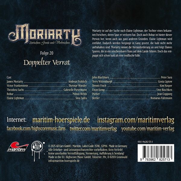Der Napoleon des Verbrechens ist zurück, Professor James Moriarty! Gesprochen von Andreas Fröhlich. Moriarty ist auf der Suche nach Elaine Lightman, der Tochter eines bekannten Forschers, deren Spur er verloren hat. Doch auch Robur ist hinter dieser Person her, wenn auch aus ganz anderen Gründen. Elaine Lightman wird entführt. Dadurch werden Vorgänge in Gang gesetzt, die bald nicht mehr aufzuhalten sind. Moriarty nimmt die Herausforderung an und folgt Elaines Spuren, die in ein unscheinbares Haus auf dem Lande führen. Doch das entpuppt sich schon bald als eine teuflische Falle.