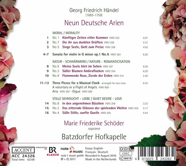 Händels letzte Vertonungen in seiner Muttersprache entstanden um die Mitte der 1720er Jahre in London. Die Texte der besonders tiefgehenden und kontemplativen Werke entnahm er dem Gedichtband Irdisches Vergnügen in Gott seines Jugendfreundes Barthold Heinrich Brockes. Der Anlass für die Komposition ist unbekannt, doch zeigt die Qualität der Musik, dass die Deutschen Arien Händel wohl besonders am Herzen lagen, auch wenn sie zu seinen Lebzeiten unveröffentlicht blieben. Marie Friederike Schöder und die Batzdorfer Hofkapelle kombinieren die Werke mit reizvoller Kammermusik des Komponisten, darunter die selten zu hörenden Stücke für eine Spieluhr.