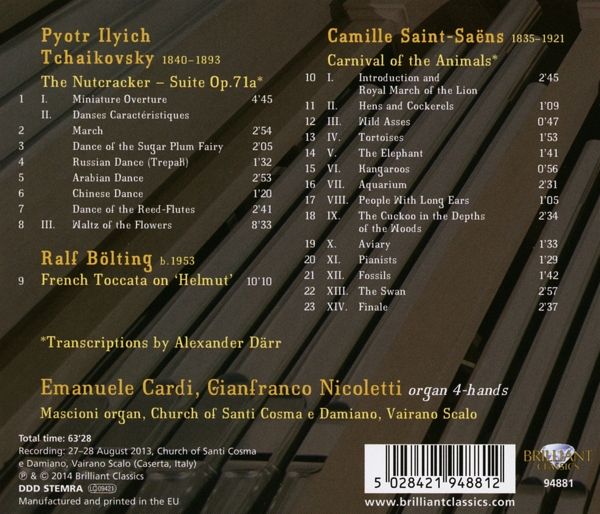 This release features two of the most famous compositions in Western music history, though not quite as the listener knows them. As with many canonic works over the course of time, Saint-Saëns's Carnival of the Animals and Tchaikovsky's Nutcracker Suite have been boldly reimagined here for organ 4-hands; transcribed by Alexander Därr, these pieces find inventive solutions to the challenges of colour and texture posed by the originals, and yet are respectful of the range and potential of the instrument. A matter of intrinsic creativity, therefore, which contrasts with earlier times in which transcriptions were a means of introducing opera to wider audiences, enriching the repertoire of certain instruments and providing adaptations for different ensembles. Also included on the set is Ralf Bölting's lively Toccata Française sur le nom Helmut, a magnificent composition that celebrates great works of the past and calls for an enormous amount of skill on the part of the players, who are faced with what one critic described as a 'staggering tour de force'. It's an exciting 'filler' on a release detailing consummate performances by maestros Emanuele Cardi and Gianfranco Nicoletti, two of Italy's leading organists. Other information: - Recorded 27-28 August, Vairano Scalo, Caserta, Italy. - This CD is a showcase of the magnificent organ, built in 2011 by the famous organ builder Mascioni, located in the Church of Santi Cosma e Damiano, in Vairano Scalo. - The seemingly boundless possibilities of this instrument, which is inspired by the legendary Cavaillé-Coll organs, are demonstrated in these spectacular arrangements of two popular scores, the Carnival of the Animals by Saint-Saëns and the Nutcracker Suite by Tchaikovsky: a festival of colours, timbres and sheer power! - Played with obvious zest and enjoyment by two fine Italian organists: Emanuele Cardi and Gianfranco Nicoletti. - Booklet contains liner notes, artist biographies and information about the organ specifications.