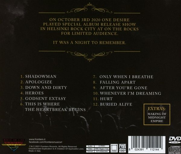 One Desire veröffentlichten 2017 ihr selbstbetiteltes Debütalbum mit großem Erfolg. Mit der Hit-Single 'Hurt' (fast 3 Millionen Aufrufe auf Youtube, fast 5 Millionen Streams auf Spotify) fand die Band ihren Weg an die Spitze der Melodie Rockszene. Auf einige erfolgreiche Europatourneen mit Eclipse und HEAT folgten bis Ende 2017 weitere Termine und Festivals, bevor die Band zurück ins Studio ging, um mit der Arbeit an ihrer zweiten Veröffentlichung zu beginnen. Das etwas mehr als zwei Jahre dauernde Album Midnight Empire hat das lange Warten, das die Fans auf neue Musik von der Band haben mussten, großzügig zurückgezahlt. Es ist ein reiferes, manchmal abenteuerliches Album, aber immer noch mit einer unglaublichen Hookiness, die die Fans vom Debüt kennen und lieben. Es war leicht eines der besten Melodic-Rock-Alben des Jahres für 2020. Nach VÖ im Mai 2020 musste sich die Band leider schnell eingestehen, dass es zu diesem Album keine anschliessende Europa oder Welt-Tournee geben wird. Als sie und der Rest der Welt sich in Bezug auf Live-Auftritte an eine neue Realität gewöhnt hatten, kam die Idee nach einem besonderen, einzigartigen Live-Produkt auf und eine Live-Aufnahme wurde am 3. Oktober 2020 in Helsinki, Finnland im On The Rocks Club realisiert. Mit nur einem minimalen Publikum, wie es heutzutage für Live-Events erforderlich ist, hat die Band eine Auswahl ihrer beliebtesten und bekanntesten Songs herausgebracht. "One Night Only - Live In Helsinki" enthält zusätzlich noch eine Reihe interessanter Bonusinhalte.