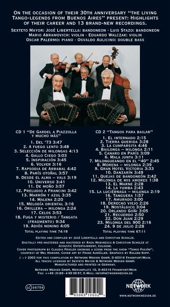 Auf 30 Jahre einer einmaligen Karriere blicken die Grammy Awards Winner Sexteto Mayor mit diesem Portrait zurück. Kein anderes Tango-Orchester ist so weit in der Welt herumgekommen, hat so viele, fast immer ausverkaufte Konzerthäuser bespielt. Sexteto Mayor, das ist klassischer Tango in moderne, brillante Arrangements gekleidet. Ihre unglaubliche Repertoire-Breite reicht vom frühen Klassiker Carlos Gardel über den revolutionären Erneuerer Astor Piazzolla bis hin zu Eigenkompositionen der beiden Bandoneón-Spieler, José Libertella und Luis Stazo. Auf 2 CDs - eine der beiden CDs eignet sich besonders zum Tanzen - zelebrieren sie mit 30 Klassikern und 13 neuen Stücken eine virtuose Hommage an die Geschichte des Genres. "Auch nach all den Jahren hat das Sexteto Mayor nichts an Passion und Fingerspitzengefühl verloren" (3sat Kulturzeit). "Sexteto Mayor präsentieren hier kunstvoll arrangierte Tangos in bester Spiellaune" (Stereo).