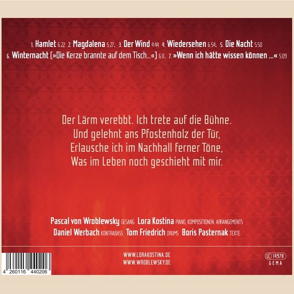 Dichter und Denker gehen in aller Regel schriftlich auf Gedankenreisen, Lora Kostinas philosophisches Fortbewegungsmittel heißt Jazz. Mit ihrem Trio hat sich die Pianistin immer wieder an das, was uns und die Welt im Innersten zusammenhält, herangetastet - im wahrsten Sinne des Wortes. Die endlos spannende Suche nach Antworten auf die Frage "Wer bin ich und wer sind wir?" teilt die gebürtige Sankt-Petersburgerin mit ihrem Landsmann Boris Pasternak (1890-1960). Dessen Gedichte veredelt das Lora Kostina Trio nun zu hochkomplexen Klangfahrten. Und siehe da: Der über die Jahre mitunter erstarrte Doktor-Schiwago-Nobelpreisträger beginnt, sich zu bewegen ...Solch eine lyrische Verjüngungskur und Neu-Aneignung funktioniert nur mit einer gestandenen Interpretin: Pascal von Wroblewsky, seit Jahrzehnten in der europäischen Jazzszene aktiv, haucht den Texten - die 70 Jahre und mehr auf dem Buckel haben, aber immer noch mehrdeutig glitzern wie russische Ikonen - gekonnt frisches Leben ein. Im Opener "Hamlet", zugeeignet dem Grübler par excellence, verwandelt sie die Verse in episches Theater, steigert sich vom emotionslosen Brecht-Sound ("Der Lärm verebbt / Ich trete auf die Bühne") hinein in die Klage des Außenseiters im "Pharisäerrudel", um sich schließlich im befreiten Scat-Singing zu erheben. Es ist ein Genuss, wie diese Ausnahme-Stimme mit den Silben spielt und gekonnt zwischen deutschen und russischen Texten wechselt, als sei es das Natürlichste der Welt.Lora Kostinas farbenreiches Klavierspiel vereint mühelos romantische Koloratur, klassische Strenge und moderne Experimentierlust. Gemeinsam mit Daniel Werbachs warm getupftem Bass und Tom Friedrichs präzis-dynamischem Schlagzeug, das auch solistisch nie in Kraftmeierei abdriftet, baut die Leipziger Jazz-Pianistin der jazzigsten Stimme Berlins einen perfekten, weil luftigen Raum. In diesem entfaltet sich nicht nur ein wunderbar wohltemperierter Gesang, sondern auch die Phantasie des Hörers. Letztere ist das eigentliche Ziel Pasternaks. Seine ins Wort verwandelten Empfindungen von Natur, Religion, Gesellschaft, Liebe sind magische Augenblicks-Perspektiven - das große Bild, den eigenen Reim auf die Geschichte muss sich jeder selbst machen: "Wer wird nach diesen Zeiten / Noch wissen, wie's uns ging / Wenn Schwätzer sich verbreiten / Doch wir schon nicht mehr sind?"