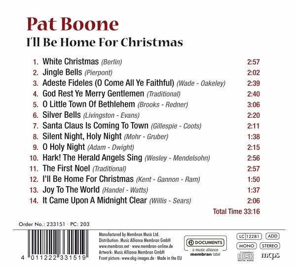 PAT BOONE Mit diesem Album trat Pat Boone erstmals mit einer allein für die Weihnachtszeit konzipierten Langspielplatte in Erscheinung. PAT BOONE 1959 Der Weltstar produzierte die Titel in dem ihm eigenen Stil. Seit dem Weihnachtshit White Christmas von Bing Crosby (1942) nahmen fast alle Stars und Sternchen Weihnachtslieder auf. Die hier vorliegende CD stammt aus einer Zeit als Weihnachten noch nicht ausschließlich kommerziell vermarktet wurde in diesen Aufnahmen spürt man noch das Besinnliche und Religiöse. Pat Boone verwöhnt unsere Ohren mit den Country-angenehmen Klängen, die nun einmal zur Winter- und Weihnachtszeit passen.