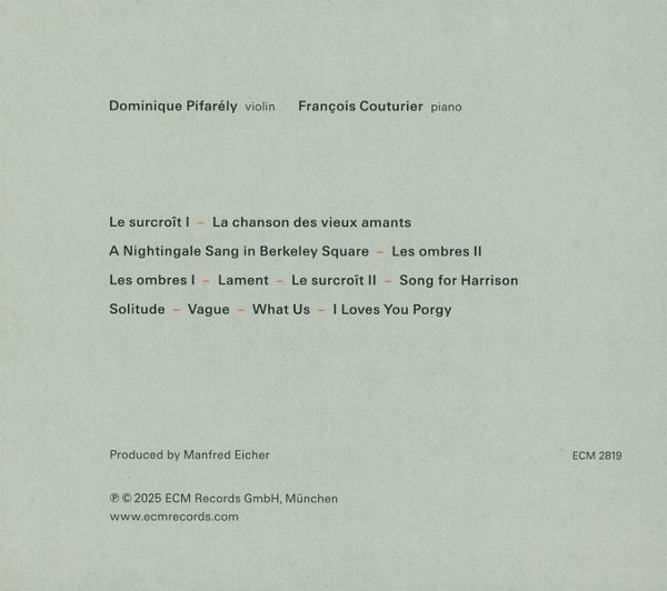 Der Pianist François Couturier und der Violinist Dominique Pifarély, wichtige Figuren der französischen Improvisationsszene, haben in den letzten 30 Jahren in vielen Projekten zusammengespielt, darunter auch in ihrem Duo, das 1997 mit dem bemerkenswerten Album Poros sein Aufnahmedebüt für ECM gab. Preludes and Songs setzt die Geschichte fort und umfasst Musik beider Musiker sowie Stücke von Jacques Brel, Duke Ellington, George Gershwin und J.J. Johnson. Mit ihrer vom Jazz und zeitgenössischer Komposition geprägten Sensibilität verwandeln Couturier und Pifarély das breit gefächerte Repertoire in fesselnde, ausdrucksstarke Musik. Preludes and Songs wurde in der außergewöhnlichen Akustik des Reitstadels Neumarkt im Oktober 2023 aufgenommen und von Manfred Eicher produziert.