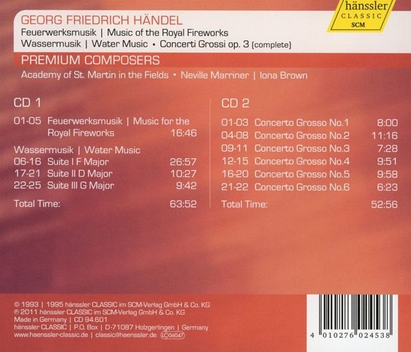 Kein Komponist ist repräsentativer für Glanz und Pracht des Hochbarock als Georg Friedrich Händel. Er war darüber hinaus auch ein echter Kosmopolit: in Deutschland geboren, in Italien ausgebildet und erfolgreich, in England beheimatet und dort gefeiert. Die "Wassermusik", die "Feuerwerksmusik" und Concerti grossi gehören zu seinen beliebtesten Werken und sind immer wieder hinreißend zu hören - vor allem in diesen authentischen englischen Interpretationen durch Neville Marriner und die Academy of St. Martin in the Fields.