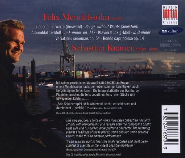 Nach seiner letzten CD mit der sensationellen Ersteinspielung von Schuberts "Sonate oubliée" setzt sich der Hamburger Pianist Sebastian Knauer nun mit dem Romantiker Felix Mendelssohn auseinander. Dessen 200. Geburtstag am 3. Februar nimmt Knauer zum Anlass, ein verbreitetes Bild des Komponisten zu hinterfragen: Mit seiner persönlichen Werkauswahl spürt er einem Mendelssohn nach, der neben sonniger Leichtigkeit auch tiefgründigere Seiten kennt. Der durchdachte Ablauf erweckt fast den Anschein eines Lieder- Zyklus ohne Worte, wobei die neu zusammengestellten Lied- Blöcke von anderen Werken gleichsam kommentierend eingerahmt werden, mit den gewichtigen Variations sérieuses im Zentrum des Ganzen. Knauers einfühlsames Spiel formt feine, mitunter vermittelte Stimmungswechsel aus und macht die teils populären, teils raren Stücke zum überraschenden Erlebnis.