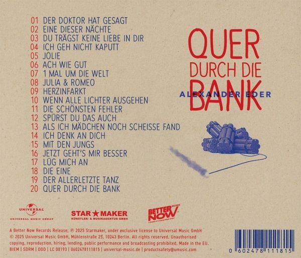 ALEXANDER EDER QUER DURCH DIE BANK ALEXANDER EDER ist alles, aber definitiv nicht normal: Sein Gaspedal ist konstant am Anschlag, seine Leidenschaft pausenlos am Limit und er steckt alles, was er hat in seine Musik. Mehr als drei Millionen TikTok-Fans und 718.000 Insta-Follower feiern den explosiven, verrückten und dabei superlässigen Sänger und Performer für Songs, die das pure Leben an die große Glocke hängen: Es geht ums laut sein, gegen den Strom schwimmen und an sich glauben - sich verknallen, mit Vollgas gegen die Wand rennen und wieder aufstehen. Ums Feiern und lebenslange Freundschaft. Wie viel Laune das macht, hört man auf seinem neuen Album QUER DURCH DIE BANK, das am 19.09. erscheint und ab heute in verschiedenen Formaten und limited Editions - z. B. samt Tickets für exklusive Release-Shows in München oder Berlin - vorbestellbar ist. Vorab gibt es gleich zwei Singles: Mit dem Doppelkracher aus 'Der Doktor hat gesagt / Julia & Romeo' bringt Alexander das ganze Spektrum - ein Track fährt auf ungebremstem Spaß und Selbstironie, während der andere den Schub ungefilterter Ehrlichkeit rauslässt. Live zündet der Turbo von ALEXANDER EDER und seiner Band 2026 wieder, wenn er ab 30. Januar mit Flightcases voller Power, Pop und Pyrotechnik die Bühnen in Deutschland, Österreich und der Schweiz abreißt