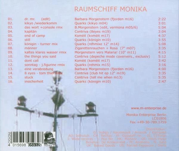 Das Berliner Label präsentiert eine erlesene Mischung vergangener Veröffentlichungen. Mit viel Liebe, unbestechlichem Geschmack und schier grenzenlosem Enthusiasmus vereinigt Monika Enterprise eine erlesene Mischung überraschender Talente, die sanftes Selbstbewusstsein oder selbstbewusste Sanftheit zu Berlins bester elektronischer Popmusik verbasteln. Albumtracks, Remixe, rare Vinyl-only-Versionen und grandiose Kollaborationen machen das "Raumschiff Monika" zu mehr als nur einer Labelcompilation. Bands und Künstlerinnen wie Quarks, Contriva, Barbara Morgenstern und Komeit präsentieren sich in bestechender Form und zeigen warum sie inzwischen auch über Deutschland hinaus ihre Fans beglücken. Besondere Momente sind u.a. die exzellente Version des Malaria!-80er-New-Wave-Klassikers "Kaltes Klares Wasser" von Barbara Morgenstern, die großartige Depeche-Mode-Coverversion "The Things You Said" von Contriva oder der Überraschungshit der prä-pubertären Rosa, die sich, begleitet von Zigarettenrauchen, ihre eigenen Gedanken über die "Männer" macht.