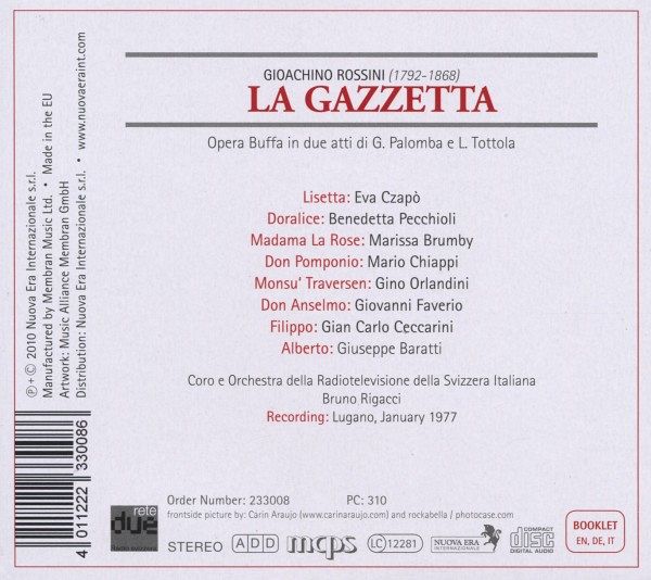 Der junge Gioachino Rossini schrieb die Oper La Gazzetta 1816 für das Teatro dei Fiorentini in Neapel, wo sie im September uraufgeführt wurde. In dieser herrlichen Komödie persifliert Rossini den Einfluss der Zeitung auf das Leben der Menschen. In der Oper sucht Don Pomponio mit Hilfe von einer Heiratsanzeige in der Zeitung La Gazzetta einen Ehemann für seine Tochter . Nach einer Reihe von unzulänglichen Verehrern und diversen Verwirrungen gibt Don Pomponio auf und Lisetta heiratet ihren Geliebten. Rossini zeigt in der Oper wieder seine Meisterschaft in der musikalischen Wiederverwertung. Er verwendete Melodien aus seinen früheren Werken, besonders Il Turco in Italia und benutzte die Ouvertüre von La Gazzetta für die spätere Oper La Cenerentola. In dieser Aufnahme singen Eva Czapò, Mario Chiappi und Gian Carlo Ceccarini die Hauptpartien, es dirigiert Bruno Rigacci.