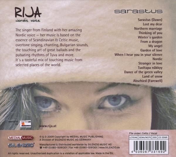Die finnische Sängerin Rija besticht mit ihrer beeindruckenden nordischen Stimme. Ihre Musik wurzelt in der Essenz der skandinavischen und keltischen Tradition genauso wie im Obertongesang, den intensiven bulgarischen Gesängen, berührenden Balladen sowie den pulsierenden Rhythmen des Tuva-Gesangs. Der Bogen dieser geschmackvollen, musikalischen Mischung überspannt zahlreiche ausgewählte Kulturen unseres Planeten.