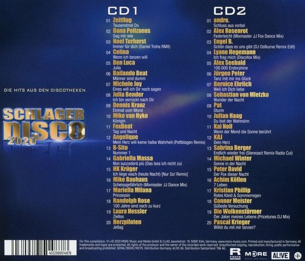 Der Name ist Programm! Diese starke Compilation ist bis oben hin vollgepackt mit den derzeit schönsten und tanzbarsten Schlagern! Also genau das, womit die zahlreichen Party-DJs zwischen Bayern und Flensburg Wochenende für Wochenende den Schlagerfans einheizen. Auf der neuen SCHLAGERDISCO 2020 findet sich alles was das Herz begehrt, um mal wieder richtig guten Schlager zu hören und dazu abzufeiern. SCHLAGERDISCO 2020 - DIE HITS AUS DEN DISCOTHEKEN bringt die Tanzfläche zum brennen!