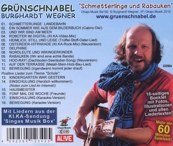 GRÜNSCHNABEL, das ist der Künstlername vom KINDERMUSIK-Komponisten, -Sänger, -Gitarristen und Konzert-Star Burghardt Wegner. Geerdet von seiner vielköpfigen Familie produziert der Norddeutsche seit 1995 etwa alle anderthalb Jahre eine neue brilliante Grünschnabel-CD.Seine besondere Art von moderner Kindermusik für die ganze Familie ist wohltuend mitreißend. Mit viel Humor und dem geglückten Transfer eines Bullerbü-Gefühls ins neue Jahrtausend schreibt der ehemalige Musiklehrer mit Gesangsausbildung poetische Liedertexte ganz nah am Kind und bettet sie in bleibende Melodien. Rockig, poppig, als Hip-Hop, Reggae, R&B oder Chanson bieten die Lieder ein unangestaubtes Musikerlebnis für klein und groß. Nach "Rap-Punzel Regenbogen", "Copea Marmelade" uva. folgt nun das neunte Grünschnabel-Album "Schmetterlinge und Rabauken". 16 Lieder und 2 Karaoke-Versionen zeigen auf über einer Stunde Spielzeit die ganze Bandbreite der Grünschnabel-Welt: Sommer und Meer, die geglückte Volksmusik-Parodie "Roboter im Digital", Abenteuer im Garten, ein Opa mit einem besonderem Beruf, Nordleute, Delphine und andere Tiere, besondere Ostererlebnisse, Kinderbanden, Sportliches und schließlich - ganz bewusst - positive Lieder über Schule, die 2011 z.T. auf der Universal-CD "Schule ist ... klasse" zu finden sein werden.