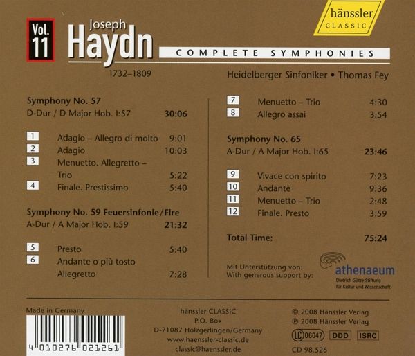 Die Gesamtaufnahme der Haydn-Sinfonien mit den Heidelberger Sinfonikern unter Thomas Fey schreitet stetig voran. Diese drei Sinfonien aus den später 1760 und 1770er Jahren zeigen einmal mehr, welch genialer und humorvoller Komponist Haydn gewesen ist. Und dem Fingerspitzengefühl, das er für den Einsatz der Instrumente verwendet, gehen Thomas Fey und seiner Musiker mit Feuer-Eifer nach. Kritiker, wie auch Klassikliebhaber zeigen sich weltweit begeistert. So, wie sie hier eingespielt worden ist, strotzt sie nur so von mitreißender Verve. www.classicstoday.com (USA)