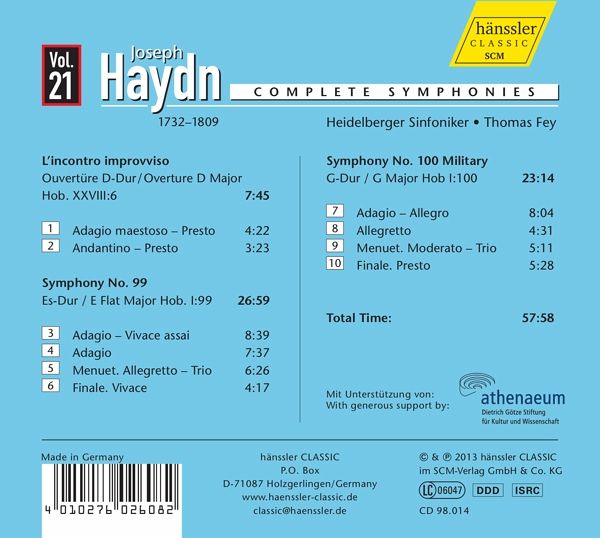 Zwei Drittel der Wegstrecke zu einer vollständigen Einspielung der Sinfonien Joseph Haydns haben Thomas Fey und seine Heidelberger Sinfoniker mit dieser Aufnahme hinter sich gebracht. Aber die Interpretation von Haydns abwechslungsreichen Meisterwerken ist so frisch wie in Folge 1. Fey versteht es, dem heutigen Hörer die Kühnheit und Schönheit der affektgeladenen Haydn-Werke nahe zu bringen. Den Interpretationen liegen zwar die Erkenntnisse historischer Aufführungspraxis zugrunde, Fey verwendet aber "moderne" Streich- und Holzblasinstrumente; bei den Blechbläsern hat er sich für historische Instrumente entschieden. Besonders deren Klang entspricht den Vorstellungen Haydns weit mehr als der heutiger Instrumente. Vol. 21 bringt die beiden Sinfonien Nr. 99 und 100 aus der Serie der Londoner Sinfonien, ergänzt durch die Ouvertüre zur Oper "L'incontro improvviso". Und gerade in diesen Werken verwendet Haydn Trompeten und Pauken sowie alle anderen Blasinstrumente. Nie zuvor außerhalb der Londoner Sinfonien hat er das getan. Ein guter Grund also, gerade diese opulent ausgestatteten Stücke in der Darstellung der Heidelberger Sinfoniker zu genießen.