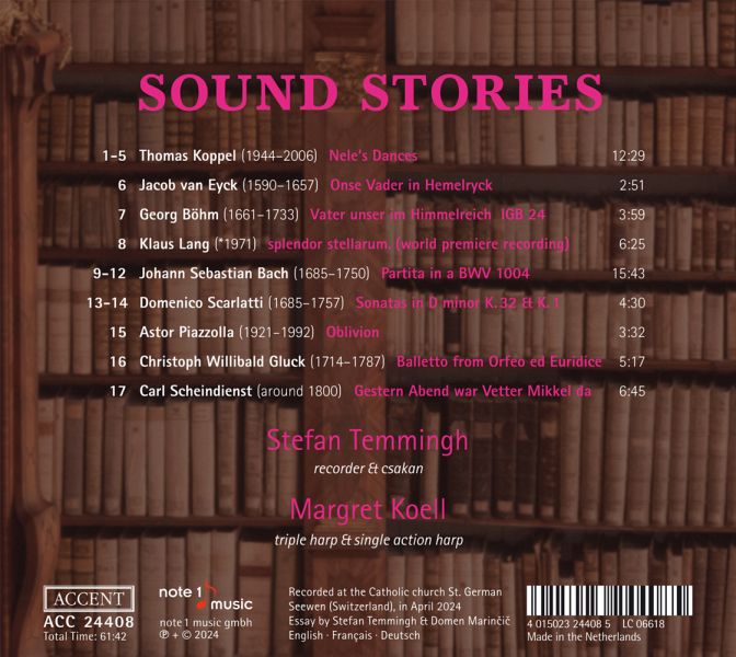 Mit Sound Stories erzählen der Blockflötist Stefan Temmingh und die Harfenistin Margret Koell Geschichten aus fünf Jahrhunderten, gespielt auf fast einem Dutzend verschiedener Flöten und drei unterschiedlichen, nach historischen Vorbildern gebauten Harfen. Die daraus resultierenden Kontraste beleuchten die Werke neu - und natürlich auch die Instrumente, für die sie komponiert wurden. Mit ihrer Auswahl, einer wilden, extravaganten und gleichzeitig sehr sinnlichen Melange, zeigen die beiden eine unglaubliche Abenteuerlust und große Neugier auf musikalische Geschichten.