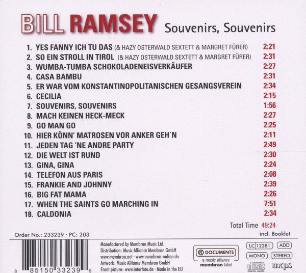 "Auf dieser CD hört man natürlich die ersten großen Schlagererfolge von Bill Ramsey. Aber dass der Mann schon vor seiner Zeit als "Schlager-Clown" ein ernsthafter Jazzsänger war, wissen nur die Wenigsten. Deshalb haben wir auf dieser CD auch seine ersten Aufnahmen als Jazzsänger verewigt. Die musikalischen Einflüsse seiner Jugend machten sich in seinem Gesang bemerkbar - seine Vorbilder waren Jazzer wie Nat "King" Cole, Count Basie, Louis Jordan oder Jimmy Rushing. 1951 wurde Bill Ramsey zur amerikanischen Air Force eingezogen und kam in Folgejahr nach Deutschland. 1953 wurde er Produzent beim amerikanischen Soldatensender AFN in Frankfurt/ Main. Auch während dieser Tätigkeit war Ramsey als Jazzsänger aktiv. Im bekannten Frankfurter "Jazzkeller" trat er regelmäßig auf. Hier lernte er auch Leute wie Paul Kuhn, Hans "James" Last und andere kennen. Sein späterer Schlagerproduzent Heinz Gietz entdeckte Bill ebenfalls in Frankfurt. Die Zusammenarbeit der beiden erwies sich bald als sehr erfolgreich. Hits wie "Souvenirs", "Schokoladeneisverkäufer", "Ohne Krimi geht die Mimi nie ins Bett" oder "Pigalle" wurden Ramsey¿s Markenzeichen. Zwischen 1959 und 1964 war Bill Ramsey mit 14 Titeln in den deutschen Charts verzeichnet."