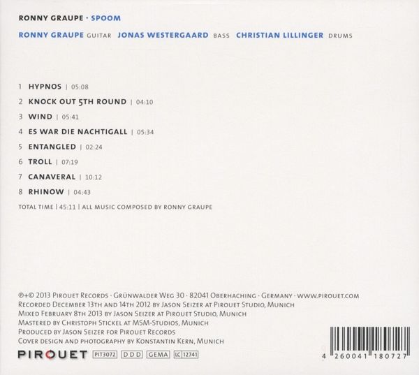 "Spoom" steht nicht im Wörterbuch - aber auf der Hülle dieser hinreißenden CD eines Trios um den 1979 geborenen deutschen Gitarristen Ronny Graupe. An einen kreativen Knall und gleichzeitig an aufschäumendes Meerwasser denkt Graupe bei diesem von ihm selbst erfundenen Kunstwort. Und er hat dazu eine Musik komponiert, die von sprühender Lebendigkeit und fesselndem Farbenreichtum ist. Zwei Partner hat der Siebensaiten-Gitarrist Graupe in diesem Trio: den dänischen Bassisten Jonas Westergaard und den Berliner Bandkollegen von Hyperactive Kid, Schlagzeuger Christian Lillinger. Mit quirliger Virtuosität, gewitzter Klang-Phantasie und auch mal hauchfeinem Balladen- Ton lassen die Musiker Bilder entstehen - in Stücken, die "Knock out 5th Round", "Troll" oder auch "Es war die Nachtigall" heißen. Mit der Komposition "Canaveral" heben sie ab ins All, und in "Hypnos" widmen sie sich dem griechischen Gott des Schlafes. Um Erde und Raum geht es im großen Ganzen - und mit raumgreifener Imagination und bestens geerdeter Kompetenz als Interpreten und stets atemberaubend flexible Improvisatoren lassen Graupe, Westergaard und Lillinger packende Hörfilme entstehen. Seine Traumbesetzung eines Trios nennt Graupe diese Band. Wie wach sie miteinander agieren, spürt man in jedem Takt. Auflegen, anklicken, dann macht es "Spoom", und das Vergnügen dürfte nicht auf sich warten lassen.