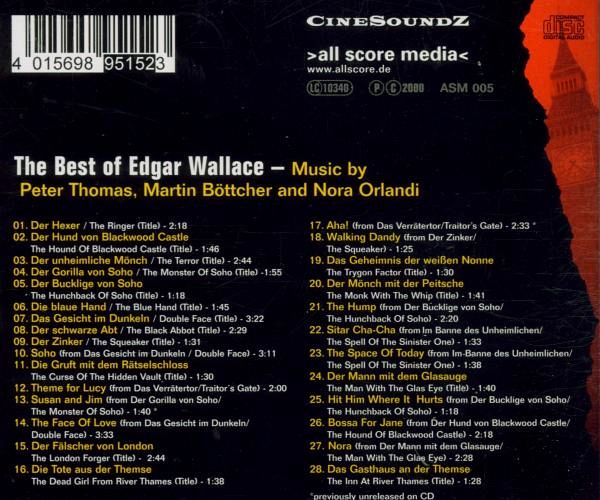 Alle bekannten Musiken der Edgar-Wallace-Filme. In den frühen sechziger Jahren begann die Produktion der Edgar-Wallace-Krimis, die zu den erfolgreichsten deutschen Filmen zählen und bis heute nichts von ihrem Kultcharakter verloren haben. Schauspieler wie Klaus Kinski, Eddie Arendt oder Joachim Fuchsberger wurden zu Stars, Titel wie "Der schwarze Abt", "Der Zinker" oder "Der Hexer" zu Inbegriffen der deutschen Filmgeschichte. Ein wichtiger Bestandteil der Filme ist immer die musikalische Untermalung der Komponisten Peter Thomas (Raumpatroullie Orion, Jerry Cotton), Martin Böttcher (Winnetou- und andere Karl-May-Filme) und Nora Orlandi, die den letzten Edgar-Wallace-Film vertonte. "The Best Of Edgar Walace" enthält als erste Platte die Originalmusik aller bekannten Filme des Krimi-Meisters. Der guten Arbeit dieser Komponisten ist es zu verdanken, dass die Musik auch ohne die Filme sehr genießbar ist. Der typische 60's-Easy-Listening-Sound kommt zu seiner vollen Entfaltung. "The Best Of Edgar Wallace" wird so zu einer Platte für Film- und Musikbegeisterte gleichermaßen. Zwei der Stücke sind noch nie auf Platte erschienen. Das Vinyl bietet den größeren haptischen und optischen Genuß (Klappcover...) sowie den Original-Vinyl-Knistersound. Wir werden es bei der einmaligen Pressung von 999 Exemplaren (durchnummeriert) belassen.