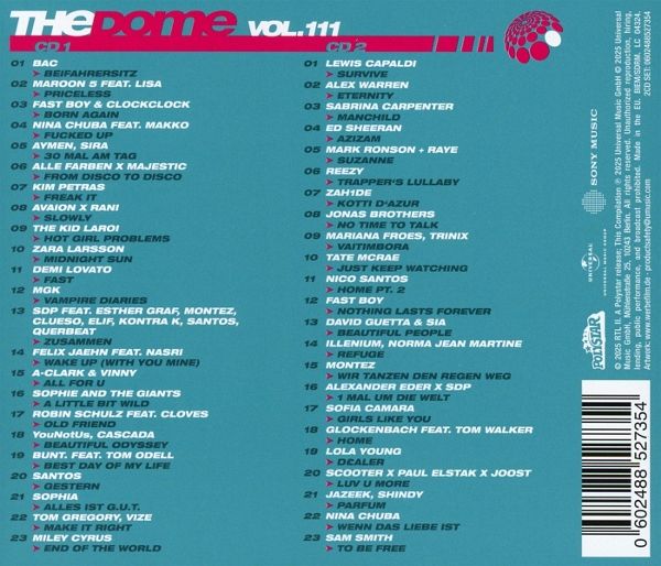 The Dome Vol. 111 wartet wie gewohnt mit aktuellen Hits und großen Stars auf: Alex Warren, Nina Chuba, bac, Lewis Capaldi, Miley Cyrus, Ed Sheeran und Sam Smith, um nur einige zu nennen. 46 Titel auf 2 CDs und als Downloadalbum.