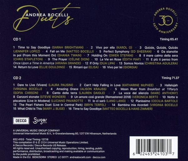 Andrea Bocelli feiert sein 30-jähriges Jubiläum mit einem ganz besonderen Album. Duets ist eine inspirierende und gefühlvolle Sammlung von Duetten. Begleitet wird der Großmeister, der in seiner langen Karriere über 90 Millionen Tonträger verkauft hat, von Superstars wie Ed Sheeran, Dua Lipa, Pavarotti, Céline Dion, Stevie Wonder und vielen mehr. Neben etlichen neuen Songs befinden sich auf der 32-Tracks starken Doppel CD und 12-Tracks Vinyl Neueinspielungen so bekannter Hits wie Time to say goodbye? an der Oscarpreisträger Hans Zimmer und Bocellis Sohn Matteo beteiligt sind. Es ist der Song meines Lebens, erzählt Andrea Bocelli über das Lied, das ihn quasi über Nacht einen Platz neben den ganz Großen der neueren Musikgeschichte gesichert hat. Nach 15 Studioalben ist Duets das erste Album seiner Art, ein Novum für den Italiener und ein emotionales Feuerwerk für alle Fans. Die Deluxe Version ist ein 42 Seiten umfassendes Buchformat mit exklusiven Fotos aus dem Bocelli-Archiv und neuen Liner Notes des renommierten Guardian-Journalisten Craig Mclean, die Andrea?s Karriere nachzeichnen.
