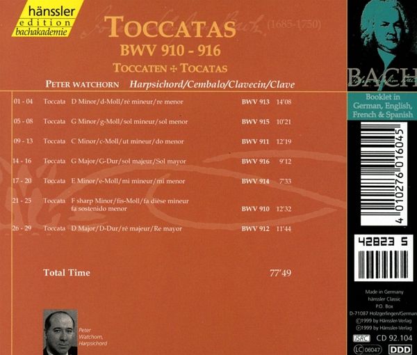 Toccaten Die sieben Toccaten von Bach bilden den Höhepunkt eines Genres mit ehrwürdiger Geschichte, die zu Bachs Zeiten bereits mehrere Jahhunderte zurückreichte. BWV 913 Toccata d-Moll BWV 915 Toccata g-Moll BWV 911 Toccata c-Moll BWV 916 Toccata G-Dur BWV 914 Toccata e-Moll BWV 910 Toccata fis-Moll BWV 912 Toccata D-Dur
