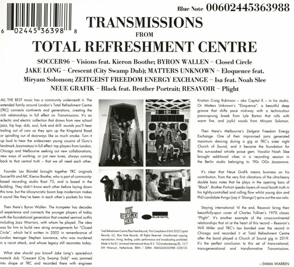 Hippen London-Touristen ist es ein Begriff: das Total Refreshment Centre. Seit acht Jahren ist es eines der wichtigsten Musik- und Kulturzentren in London, zahlreiche Musiker und Künstler haben den Raum genutzt, sich zu treffen, zusammenzuarbeiten und zu kreieren. Bands wie Sons of Kemet, The Comet Is Coming, Neue Grafik, Snapped Ankles, Bo Ningen, Flamingods, Alabaster Deplume, Rozi Plain, Soccer 96, Vels Trio, Makaya Mcraven und viele mehr sind dort aufgetreten. Auf dem Album Transmissions From Total Refreshment Centre sind jetzt erstmals einige der wichtigsten Künstler aus dem Umfeld des kreativen Melting Pots zu hören, mit einer lebendigen, eklektischen Mischung aus New Jazz, Hip Hop, Elektro, Dub, Soul, Funk.