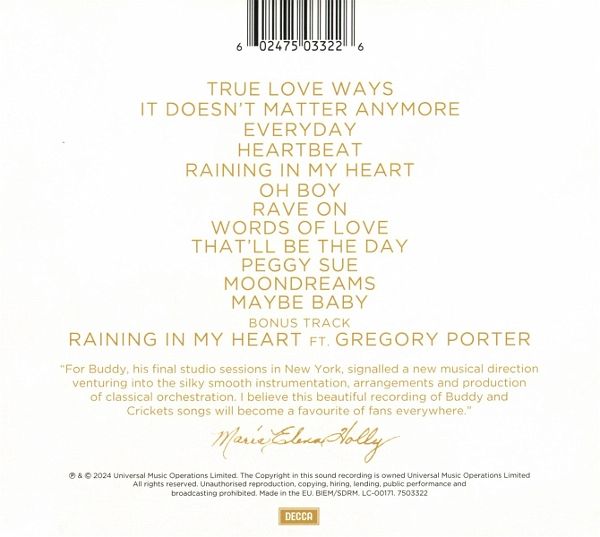 Für Musikfans auf der ganzen Welt ist es eine aufregende Ankündigung, dass Decca Records das hochgelobte Album 'Buddy Holly With The Royal Philharmonic Orchestra - True Love Ways' neu auflegt. Diese außergewöhnliche Sammlung der zeitlosen Songs von Buddy Holly, wunderschön arrangiert und aufgenommen mit dem Royal Philharmonic Orchestra, bietet eine neue Perspektive auf seinen legendären Katalog. Die Neuauflage enthält einen bisher unveröffentlichten Bonustrack mit dem Grammy-Preisträger Gregory Porter, der zum ersten Mal über Digital Service Provider (DSP) und physisch erhältlich sein wird. Das Album 'True Love Ways', das Hollys bahnbrechenden Rock'n'Roll-Sound mit den üppigen Arrangements des Royal Philharmonic Orchestra verbindet, hat das Publikum seit seiner ursprünglichen Veröffentlichung in seinen Bann gezogen. Diese Wiederveröffentlichung feiert Hollys anhaltenden Einfluss auf die Musik und stellt sein Werk einer neuen Generation von Fans vor.
