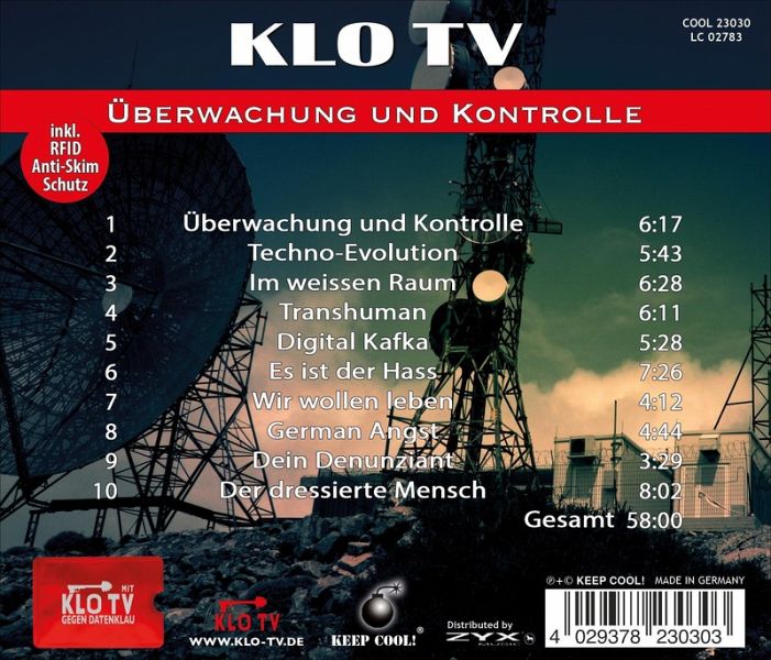 Das digitale Zeitalter schreitet voran und automatisiert die autoritäre Herrschaft. Doch Klo TV widerspricht, dass es nur so kracht. Auf dem Debüt-Album Überwachung und Kontrolle verhören sie ihre Fans mit schnellen Beats und schrillen Gitarren. Klo TV ist auf unheimliche Weise perfekt. Millionen Viewer stehen auf ihre Videos. Dystopischer Überwachungshorror kann also doch geil sein. Du liebst die Future Sounds aus Techno Evolution, die Punk-Attitude in Digital Kafka oder stehst auf Retro-Manier in Es ist der Hass? Dann Gnade deinem Social Scoring Die CD enthält eine RFID-Schutzhülle, damit Karten-Chips von Unbefugten nicht ausgelesen werden können. Der rote Anti-Skim-Schutz trägt den Aufdruck Mit Klo TV gegen Datenklau.