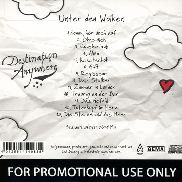 "Unter den Wolken" ist das neue Album von Destination Anywhere, welches von tanzbarem Ska bis zu erwachsenem Punkrock eine breite und bunte Palette Musik im Angebot hat. Während der Opener Komm, hör doch auf die Platte druckvoll und frech á la Kraftklub einläutet, lassen sich lustig verspielte Lieder wie Couchurlaub oder Alina in der Nachbarschaft der Sondaschule oder des Farin Urlaub einordnen. Weitere eindrucksvolle Aspekte der Band zeigen sich mit melancholisch-emotionalem Punkrock, der textlich in deutscher Sprache an die besten Momente von Alkaline Trio erinnert und in modernem Gewand dem schnellen Punkrock der frühen Blink 182huldigt (Ohne Dich, Dein Stalker). Destination Anywhere wären jedoch nicht Destination Anywhere, wenn sie nicht auch in Osteuropa nach Inspiration suchen würden (Kasatschok) und ihren Hörern so eine unvergleichliche Abwechslung bieten würden. Am Ende der abenteuerlichen Reise durch die 13 neuen Songs der Band wird in Die Sterne und das Meer jedoch bewiesen, was sich schon zuvor angekündigt hat - die Band wird erwachsen und ist tatsächlich "schon lange nicht mehr 16"... Produziert wurde das neue Album ein weiteres Mal von David Bonk, der es wie kein anderer beherrscht die Vielseitigkeit der Band in eine druckvolle, zeitgemäße und spannende Produktion zu kleiden.