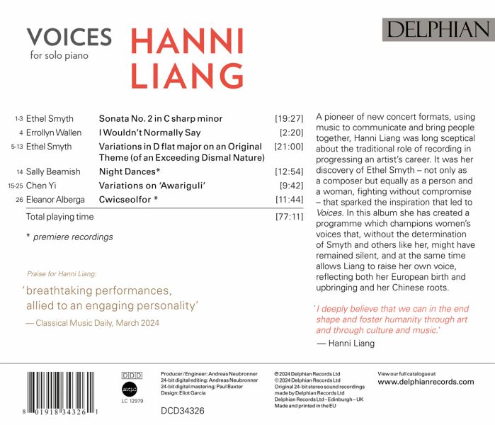 Es war die Entdeckung der Komponistin Ethel Smyth (1858-1944), sowohl als Künstlerin als auch als Mensch und Frau, die bei Hanni Liang die Inspiration für das vorliegende Album Voices auslöste. Auf dieser Einspielung stellt sie ein Programm vor, das die Stimmen von Frauen würdigt, die ohne die kämpferische Entschlossenheit Smyths und anderer Komponistinnen vielleicht für immer stumm geblieben wären. Gleichzeitig gibt es auch der eigenen künstlerischen Stimme Liangs ein Forum, das sowohl ihre europäische Geburt und Erziehung als auch ihre chinesischen Wurzeln widerspiegelt.