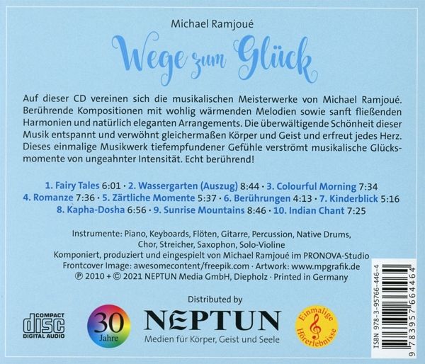 Auf dieser CD vereinen sich die musikalischen Meisterwerke von Michael Ramjoué. Berührende Kompositionen mit wohlig wärmenden Melodien sowie sanft fließenden Harmonien und natürlich eleganten Arrangements. Die überwältigende Schönheit dieser Musik entspannt und verwöhnt gleichermaßen Körper und Geist und erfreut jedes Herz. Dieses einmalige Musikwerk tiefempfundener Gefühle verströmt musikalische Glücksmomente von ungeahnter Intensität. Echt berührend!