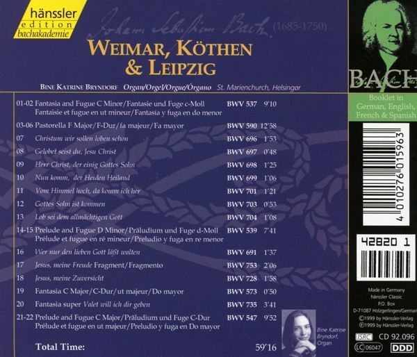 Orgelwerke - Weimar, Köthen und Leipzig Mit dieser CD öffnet sich dem Hörer gleichsam ein Schmuckkästchen der Bachschen Kompositionskunst für Orgel. Wie sich in einem solchen kleine Edelsteine aufgereiht an einer Kette neben dem großen Solitär finden, so auch hier kostbare Miniaturen neben großangelegten Formen. BWV 537 Fantasie und Fuge c-Moll BWV 590 Pastorella F-Dur BWV 696 Christum wir sollen loben schon BWV 697 Gelobet seist du, Jesu Christ BWV 698 Herr Christ, der einig Gotts Sohn BWV 699 Nun komm, der Heiden Heiland BWV 701 Vom Himmel hoch, da komm ich her BWV 703 Gottes Sohn ist kommen BWV 704 Lob sei dem allmächtigen Gott BWV 539 Präludium und Fuge d-Moll BWV 691 Wer nur den lieben Gott läßt walten BWV 753 Jesu, meine Freude BWV 728 Jesus, meine Zuversicht BWV 573 Fantasie C-Dur BWV 735 Fantasie super: Valet will ich dir geben BWV 547 Präludium und Fuge C-Dur