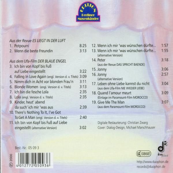 | 3 | Ich bin von Kopf bis Fuss auf Liebe eingestellt (from Original Soundtrack "Der blaue Engel") | 00:03:23 | |