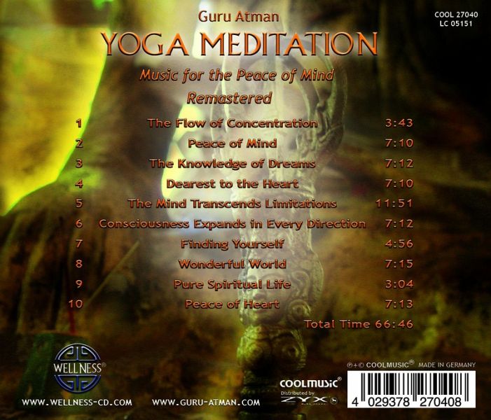 Guru Atman formt eine einzigartige Klangwelt aus indischen und westlichen Harmonien. Einfu¿hlsam begleiten die To¿ne der Bansuri, einer traditionsreichen Bambusflo¿te, weiche Sitar-Klänge. "Yoga Meditation" wirkt beruhigend und unterstu¿tzt den Zustand der Meditation. Guru Atmans meditative Musik wahrt ein harmonisches Verhältnis von Spannung und Entspannung, sie verhilft zu innerer Gelassenheit. Yoga Meditation wurde von Chris Cool in 24Bit/96kHz remastered. Dauer: 66:46