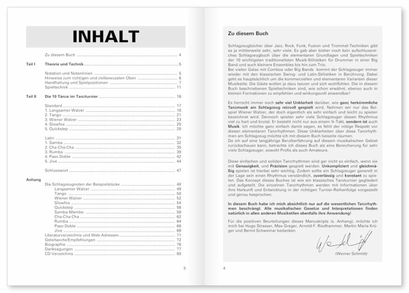 Dieses Buch füllt eine große Lücke in der Literatur für Schlagzeug:ein Lehrbuch über die elementaren Grundlagen und Spieltechniken der 10 wichtigsten traditionellen Tänze für Drummer in einer Big Band und in kleineren Ensembles bis hin zum Trio.Bei Galas mit Combos oder Big Bands kommt der Schlagzeuger immer wieder mit den klassischen Swing- und Latin-Stilistiken in Berührung, aber es herrscht immer noch sehr viel Unklarheit darüber, wie ganz herkömmliche Tanzmusik am Schlagzeug reizvoll gespielt wird. Diese Unklarheit möchte ich mit diesem Buch beiseite räumen.Einfache Tanzrhythmen sind gar nicht so einfach, wenn Genauigkeit und Präzision gefordert sind. Unkompliziertheit und rhythmische Gleichmäßigkeit sind dabei genauso wichtig wie verständliches und zuverlässiges Spiel.Da ich auf eine langjährige Berufserfahrung auf diesem musikalischen Gebiet zurückschauen kann, betrachte ich dieses Buch als eine Bereicherung für sehr viele Schlagzeuger, sowohl Profis als auch Amateure. Dieses Buch ist wie ein klassisches Tanzturnier gegliedert und aufgeteilt: Die einzelnen Tanzrhythmen werden mit Informationen über ihre Herkunft und Entwicklung in der richtigen Turnier-Reihenfolge vorgestellt und genau besprochen. Ich habe mich hier ganz absichtlich auf die wesentlichen Tanzrhythmen beschränkt.Alles hier Gesagte ist natürlich in allen anderen Musikstilen ebenfalls anwendbar!