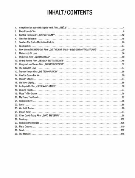 Einige Klaviermelodien sind bekannten Filmen entnommen und mittlerweile so beliebt geworden, dass sie jeder Klavierspieler gerne nachspielen möchte. Dazu gehören Stücke aus Amélie, Twilight, Forrest Gump sowie Ziemlich beste Freunde und natürlich das berühmte Klavierstück River Flows in You von Yiruma. Viele weitere wundervolle Stücke sind in diesem Pianoalbum enthalten, von romantisch, minimalistisch, meditativ bis rockig-poppig.