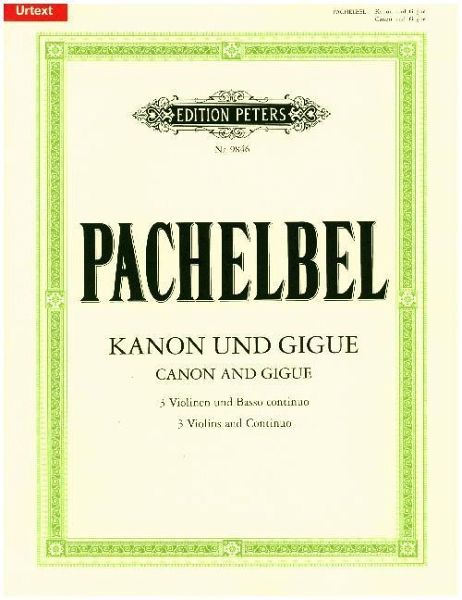Pachelbel's Canon & Gigue in D for three violins and basso continuo. Edited by Anne Marlene Gergel, continuo part by Johannes Muntschick, and labelling of the violin part by Christoph Jacobi. Separate parts and score included.