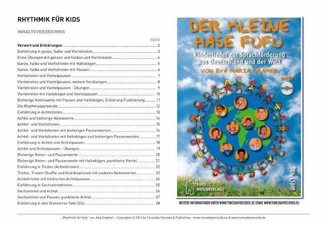 Dieses Notenheft erhebt dabei in keinster Weise den Anspruch alle rhythmischen Notationsformen und Möglichkeiten systematisch abzubilden. Dafür ist das Thema viel zu komplex! Vielmehr werden hier Eltern, Erzieher und vor allem die Kinder bei der Hand genommen, um bei moderat steigerndem Schwierigkeitsgrad rhythmische Übungen mit viel Vergnügen und Spielfreude zu meistern. Eine ideale Vorbereitung für spätere musikalische Erfahrungen, ob gemeinsam in einem musikalischen Ensemble oder alleine mit einem noch zu lernenden Musikinstrument.