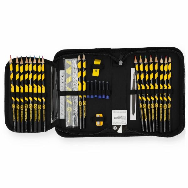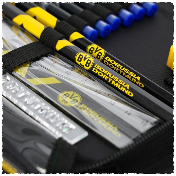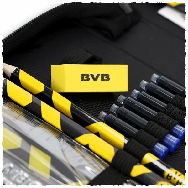 Alles im Griff. Das BVB-Etui ist der ideale Begleiter durch den Schultag. Mit 16 Buntstiften, zwei Bleistiften, einem Lineal, einer Buchstabenschablone, einem Anspitzer, sechs Tintenpatronen und einem Radiergummi ist das Etui mit fast allem befüllt, was man im Unterricht braucht. Nur der Füller ist nicht im Lieferumfang enthalten.