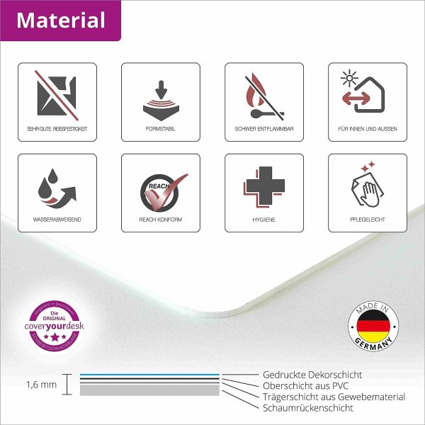 Diese Schreibtischunterlage aus 1,6mm dickem, hochwertigem Premium Vinyl bietet einen angenehmen Schreibkomfort und eine tolle Haptik. Sie wird in Deutschland hergestellt.