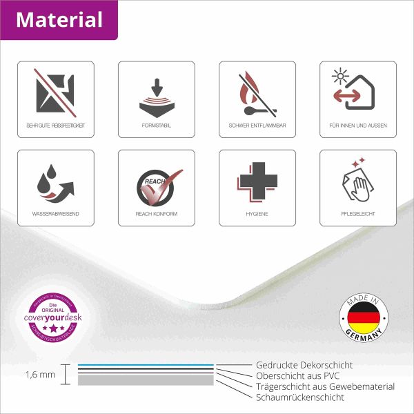 Diese Schreibtischunterlage aus 1,6mm dickem, hochwertigem Premium Vinyl bietet einen angenehmen Schreibkomfort und eine tolle Haptik. Sie wird in Deutschland hergestellt.