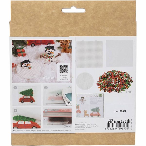 Perlen-Set mit allem, was Sie benötigen, um fünf wunderschöne Weihnachtsmotive zu basteln. Mit unserem Kreativ Set können Sie ganz einfach mit der Herstellung von Weihnachtsmotiven aus NABBI BioBeads beginnen. NABBI BioBeads sind Schmelzperlen aus einem Material namens Biodolomer – und biologisch abbaubar. Wenn Sie die NABBI BioBeads bügeln, denken Sie daran, Backpapier zwischen das Bügeleisen und die Perlen zu legen und das Bügeleisen mit leichtem Druck in kreisenden Bewegungen zu führen, bis die Perlen miteinander verschmolzen sind.