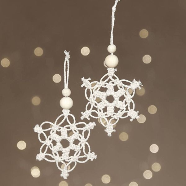 Mini Kreativ Set für 2 Makramé-Schneeflocken mit dekorativen Holzperlen - zum Aufhängen.
