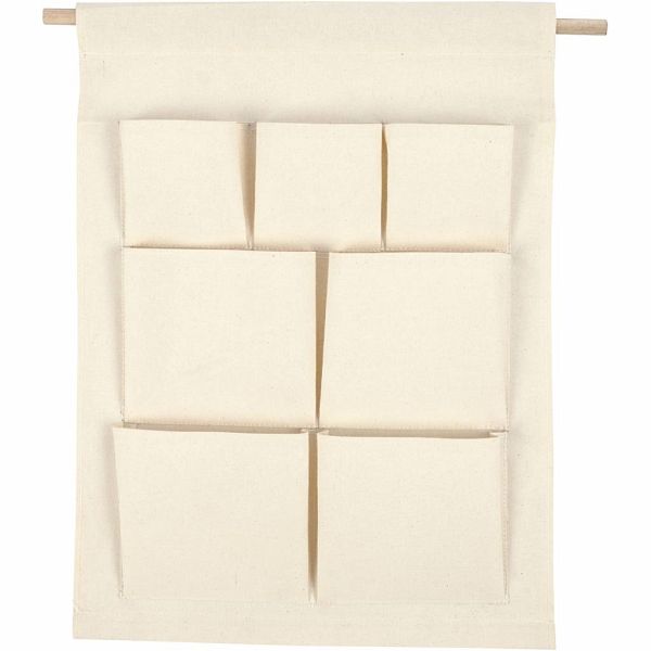 Praktische Organizer-Taschen aus dickem Canvas mit kunststoffbeschichtetem Rücken für gute Stabilität - oben mit Tunnel zum Einführen eines runden Holzstabs zum Aufhängen - ideal für die Aufbewahrung div. Kleinigkeiten oder z. B. als Adventkalender - Stoff kann mit Textilmarkern, Stofffarbe etc. dekorativ bearbeitet werden. Verwendung als Adventkalender, zur Aufbewahrung von Büromaterial, Werkzeug, Spielzeug usw.. Deko mit Textilmarkern, Stempeln, Filz, Stoff, Stickern, Bügelmotiven etc. - Bügeln nur auf der Vorderseite (Rückseite ist kunststoffbeschichtet).