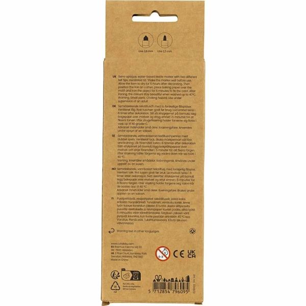 Schütteln Sie den Marker vor Gebrauch gut und legen Sie Kunststoff oder Pappe z. B. in T-Shirts und Tragetaschen, damit die Farbe nicht durchdringt und auf der Rückseite abfärbt. Wenn die Farbe trocken ist, legen Sie zum Bügeln Backpapier auf und unter das Textilstück. Nach dem Bügeln bewahren die Farben beim Waschen bis zu 40°C ihre Schönheit. Beachten Sie, dass der Marker perfekt für leichte Baumwolltextilien usw. geeignet ist.