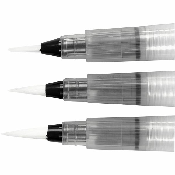 Runde Pinsel mit feinen Nylon-Borsten und hohlem Schaft aus Plastik - Wasser einfüllen und beim Malen mit leichtem Druck auf den Schaft nach und nach entleeren - perfekt geeignet für die Arbeit mit Aquarellfarben. .