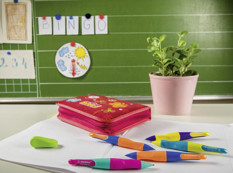 Ergonomischer Druckbleistift STABILO® EASYergo 1.4, Ausführung: Spitze voll versenkbar, Mine auswechselbar, Mine federnd gelagert, Druckmechanik, Material des Schaftes: Polypropylen. Mit Feld zur Namensbeschriftung, Ausführung der Griffzone: längere Griffzone (für ältere Kinder) aus rutschfestem Material, innovatives, ergonomisches Stift-Design speziell für Kinderhände. Entspannte Handhabung und leichte Schreibführung, nur geringer Druck notwendig. Unterstützt präzises Schreiben auf feinen Linien und kariertem Papier, Farbe des Schaftes: türkis/neonpink, Stärke der Mine: 1,4 mm - daher Spitzen nicht notwendig, Bezeichnung der Härte: HB.